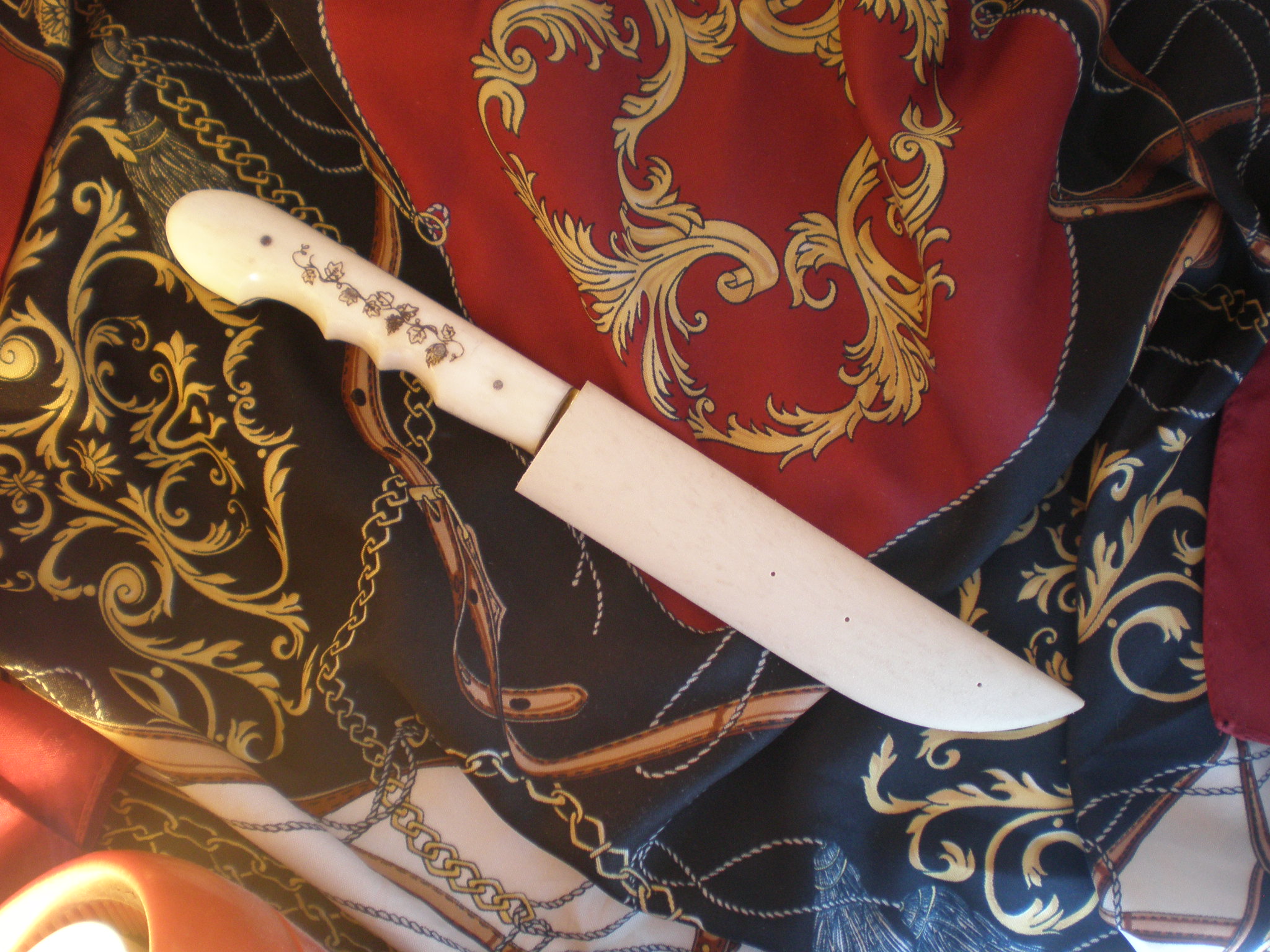 Ну, во первых, не пчак, а классический греческий нож. Рукоять очень характерная. :D И не из керамики, а какая-то простенькая железка, такое впечатление, что отхромированная., т.к. при всей блескучести на РК заметны следы коррозии. Завтра подправлю.