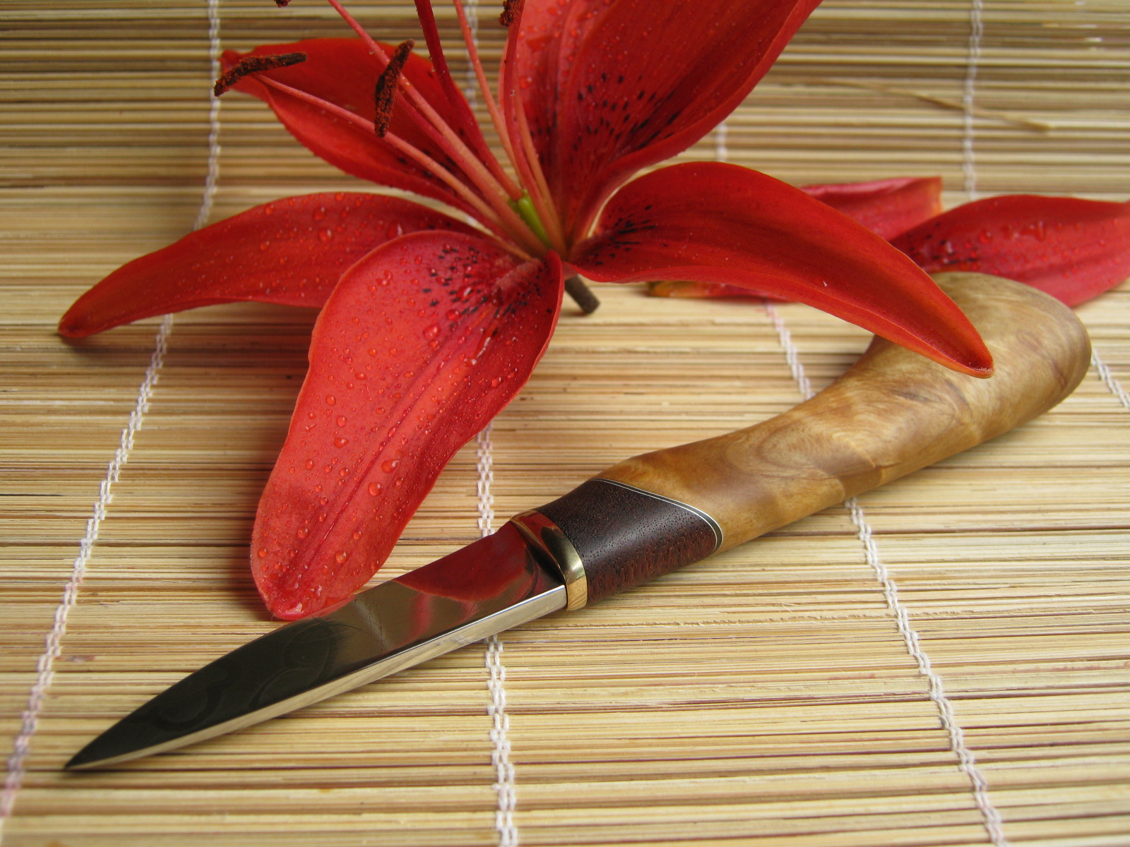 Рукоять: бронза, мербау поперек, фольга нержа, картон, сувель березовая. Пропитана в масле для полока. Пин самодельный. Монтаж всадной на эпоксу. Ножны наверное будут, как только решу какие.