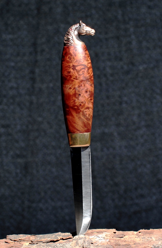 Рукоять - оковка латунь (покупная), кап березы (компот морилок, полок, шеллак), голова лошади - бронза литьё, покупная. Монтаж сквозной на эпоксу и гайку (голова сидит на конце хвостовика после гайки). Размеры рукояти 115 (в холке)х30х20 мм.