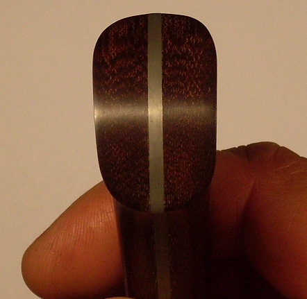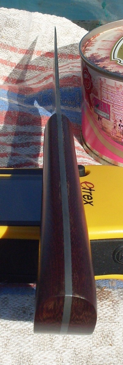 Я старался :wink: . Вы правы, форма клинка из детства, похожей формы нож, размером поболее, у знакомого пацана - орешину с мою руку срубал влёгкую(запомнилось). Я только спрямил обух, подвод сделал, рукоять немного дань востоку, всего понемногу.