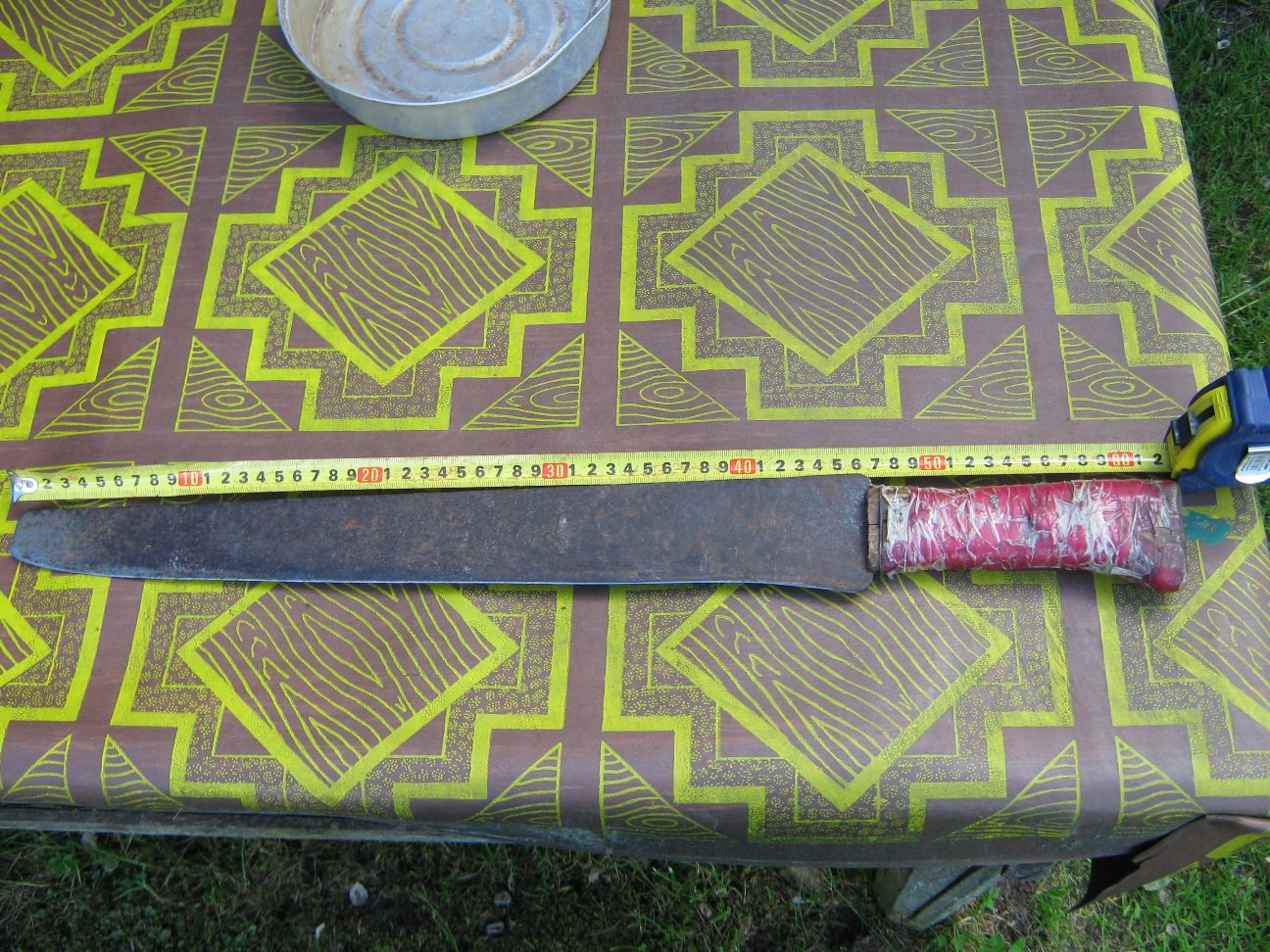 Решил написать не много про самый пользуемый мною в деревне инструмент. В общем-то я не знаю, что это, но это было потеряно дорожниками. Как то давно, лет этак ...дцать назад, чистили они канавы и забыли его. С тех пор он служит нам, верой и правдой, первый помощник при рубке, расчистке, дрова, ветки -все ему по плечу! Почти уверен, что сделан он из полотна пилы и видимо с какой то промышленной. Хорошо держит заточку, не скалывается, а заминается на твердом, но очень не охотно. Ржавеет тоже с трудом: полотно потемнело давно, а вот РК за зиму лежания без дела только местами имеет рыжеватые пятна, да и те быстро выводятся при заточке. Единственный спорный момент в сём изделии - это рукоять. Вроде и удобная, но великовата для меня. Монтаж накладной, фиксация проволокой и изолентой. В общем-то незамысловатый инструмент, как и работа им выполняемая!