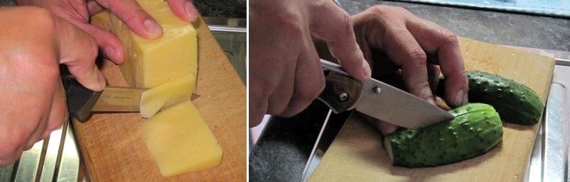 Первым делом я натравил ножи на продукты. Твердокопченую колбасу и хлеб складники резали одинаково хорошо. Шведский фикс естественно не отставал от них. “Стэлс” лучше всего рассекал помидоры, буквально проваливаясь в них. “Зубр” взял первенство на огурцах. “Пика” заняла твердое второе место. Шведская Mora огурцы от середины реза раскалывала. Но она лучше всех резала сур, в котором складники всё-таки вязли.