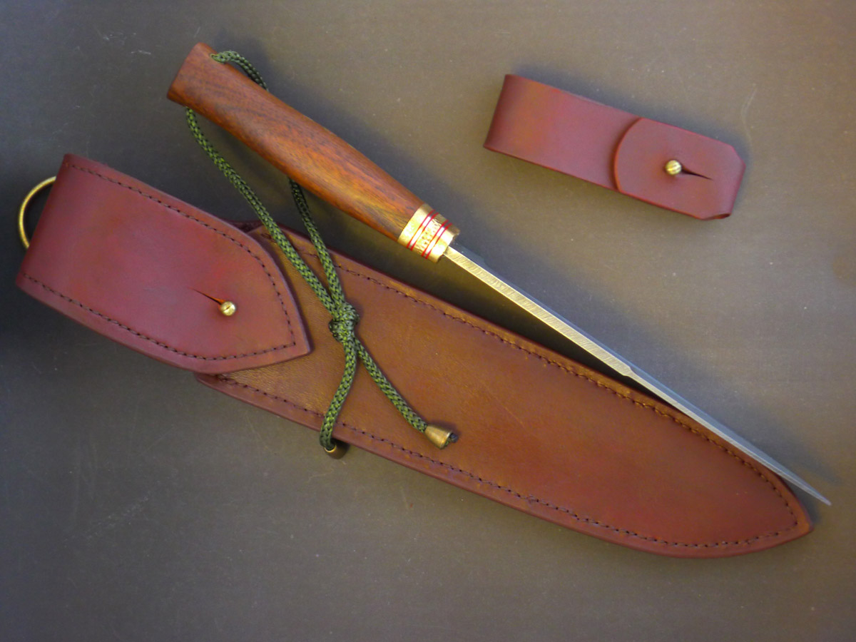 На таком клинке чойл сам работает как односторонняя гарда, поэтому делать гарду было излишне. Даже чисто визуально дискомфорт. Больстера было бы достаточно. Насечка на торцевой стороне гарды тоже поднадоела. Выглядит как способ замаскировать касяки. Ну и ножны незачёт. В меру украшенный нож + совершенно неукрашенные ножны, на которых сразу бросается в глаза не совсем ровный шов. Как то не так. Да, ещё темляк. Всё достаточно в наруральном стиле, типа дамаск, дерево, кожа и вдруг синтетический шнур тактического цвета. Снова дискомфорт.