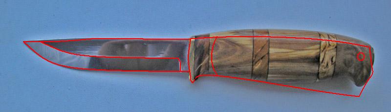 клинок простой, к нему столько удачных форм рукояти можно подобрать, от классчической финки, до томми, или просто нож традиционный, а то что получилось, как то не вписывается в мой воспалённый мозг, в качестве гармоничных линий ножа, так и общей концепции, удобства.