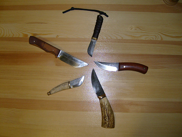 Все ножи из Р6М5 или HSS,рукояти(на первом фото, сверху вниз) - текстолит (заточка клинка односторонняя), рог лося, красное дерево(пропитывал 3 дня в льняной олифе и сушил месяц), рог(нож сделал для дочери, как канцелярский)