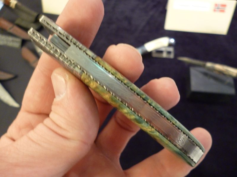 Редкостный халтурщик из Америки. Делает ножи в скандинавском стиле, но на уровне кустарщины. Очень много касяков, особенно на фоне остальных выставочных Мастеров. На кой он вообще через Атлантику летел? Единственные 2 ножа, сделаные в американском стиле более мение, остальное в топку. Я кстати ему ножны нечаянно на леуку порезал.