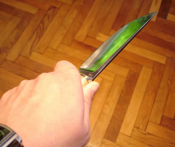 Фотка действительно шикарная. Кроме того что красивая еще и показывает как именно сделан больстер, на сколько плотно подогнан (причем это норма :!: на всех ножах Чебуркова так), и даже можно отследить вогнутость спуска (по перепаду с несведенной части клинка).