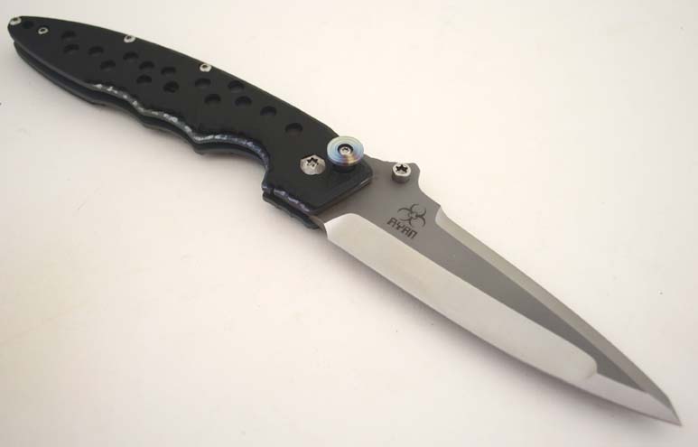 Автомат срабатывает при сдвигании левой плашки. Большая "заклепка" на оси клинка на левой плашке - "фальшивая", она крепит только накладку из G-10.